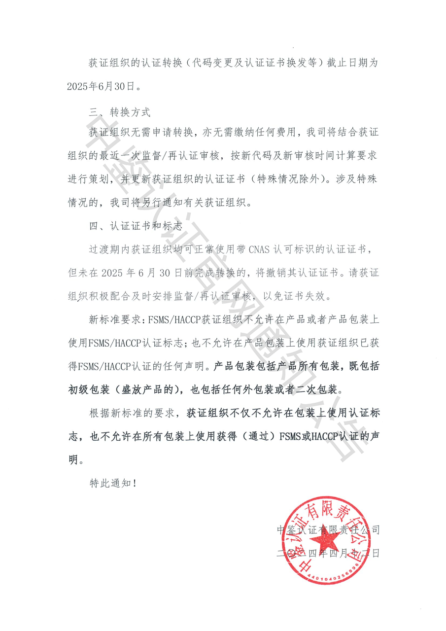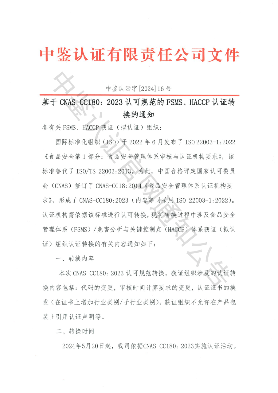 中鉴认函字[2024]16号 基于CNAS-CC180:2023认可规范的FSMS、HACCP认证转换的通知